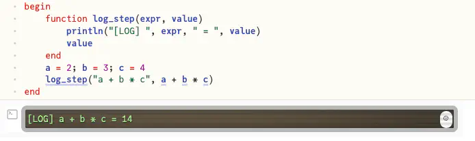 And get outputs like this: [LOG] x + y * z = 42
